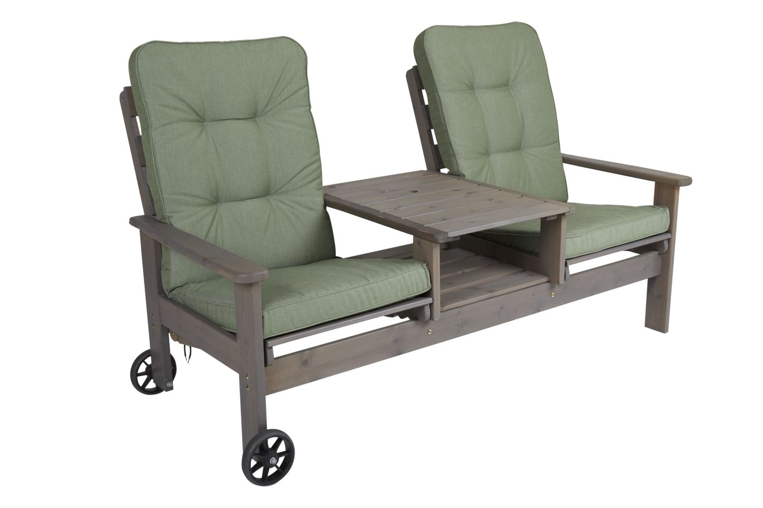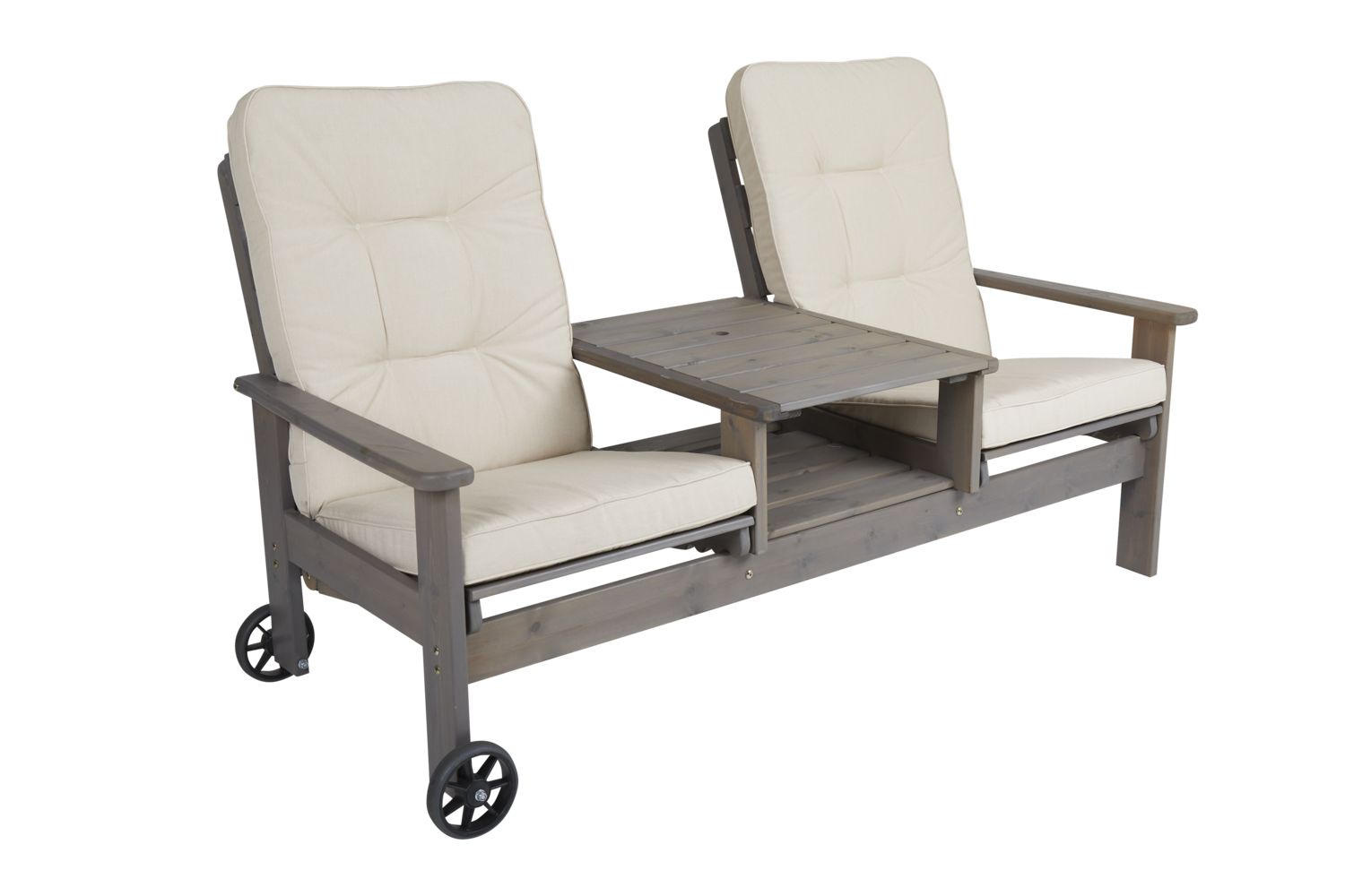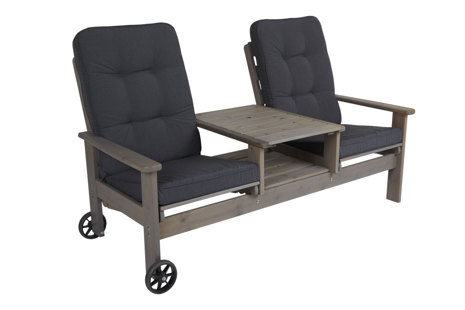 Das klassische Möbel für Zwei ist dreifach verstellbar und zum einfachen Platzieren mit Aluminiumrollen versehen. Komplettieren Sie z. B. mit dem Hochlehner Trento für zusätzlichen Sitzkomfort.