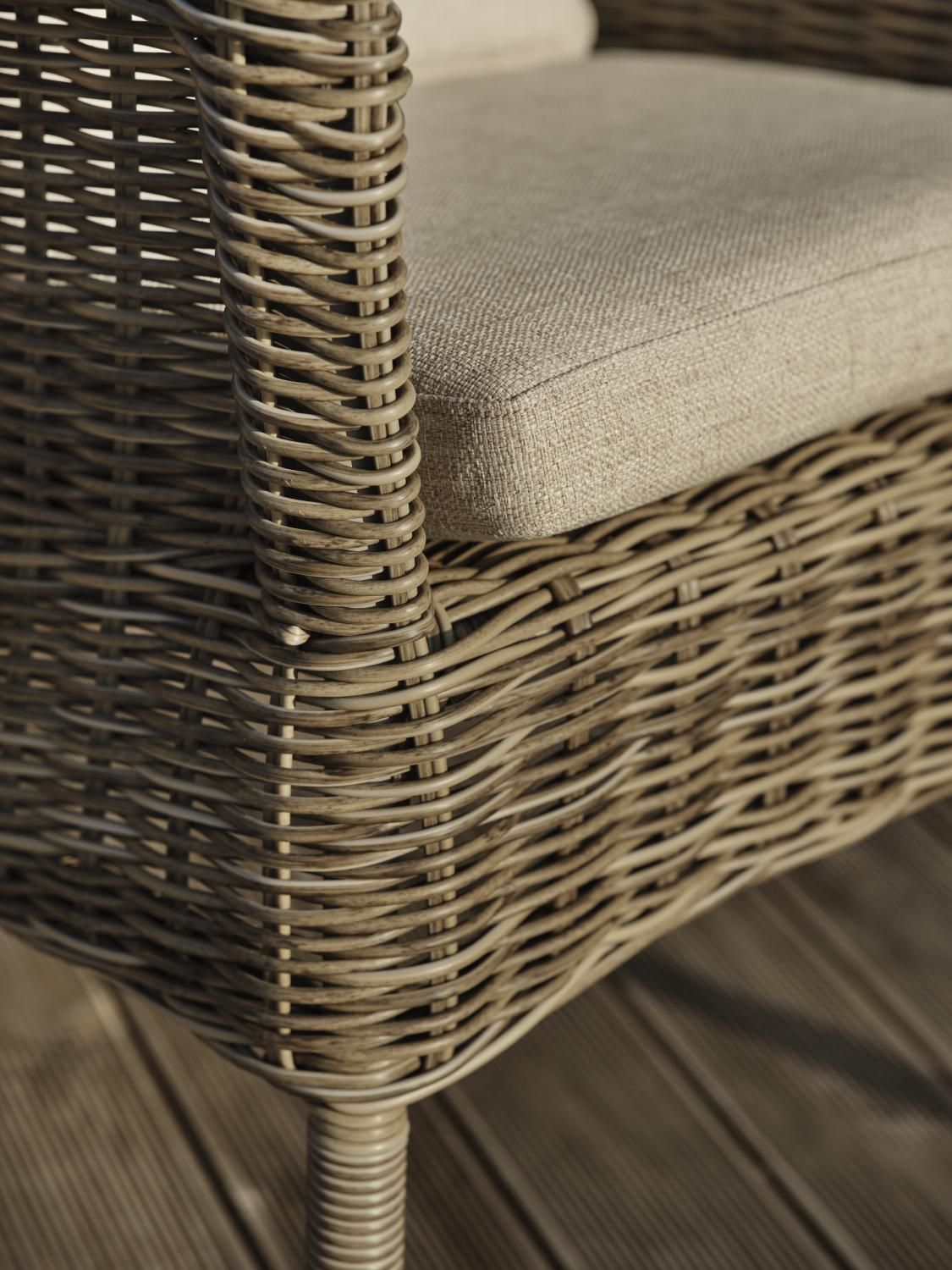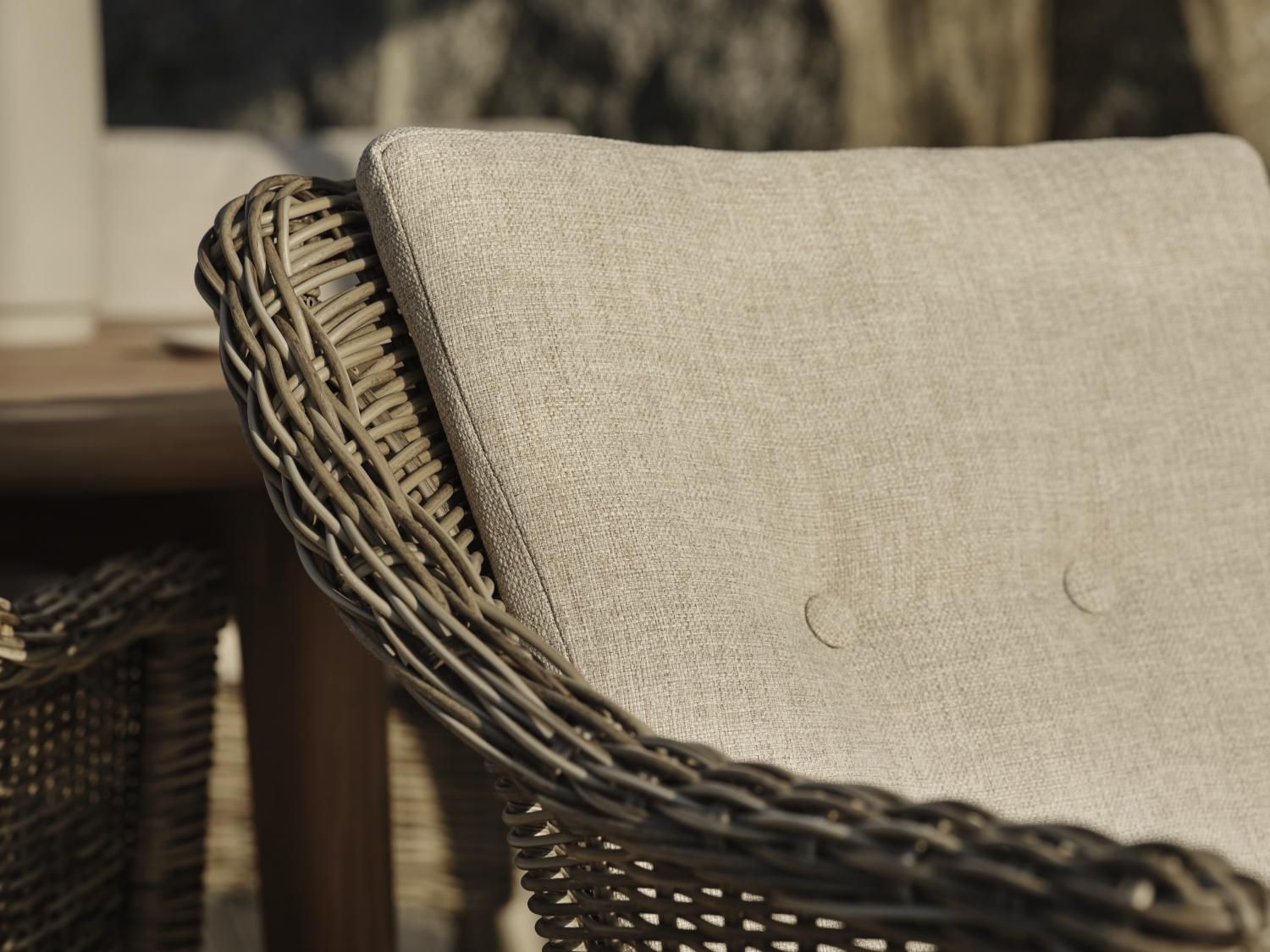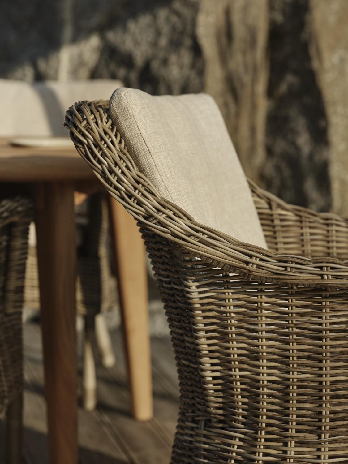 Ein bequemer Sessel in einem rustikalen Stil, der für unsere Esstische aus Teak perfekt ist. Ausgestattet mit Kissen in beige.