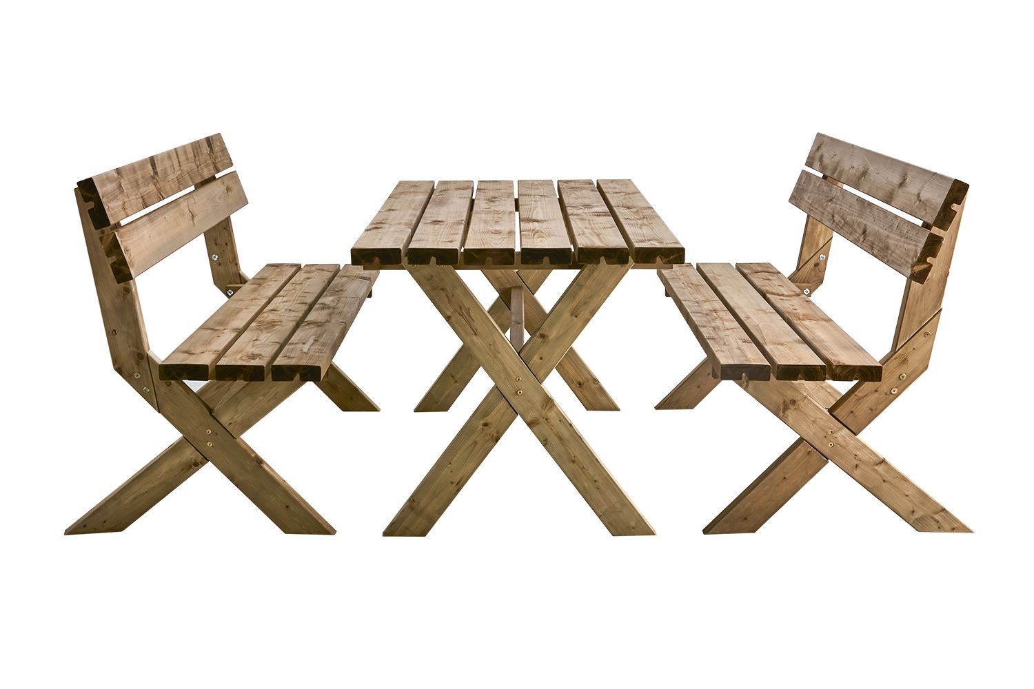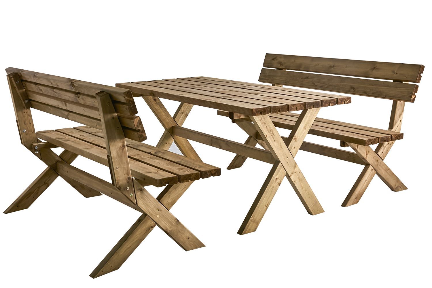 Stabiles Picknick-Set mit zwei Gartenbänken und einem passenden rechteckigen Tisch. Alles aus braun imprägniertem Kiefernholz – die perfekte Kombination aus Langlebigkeit und Funktionalität für Outdoor-Aktivitäten.