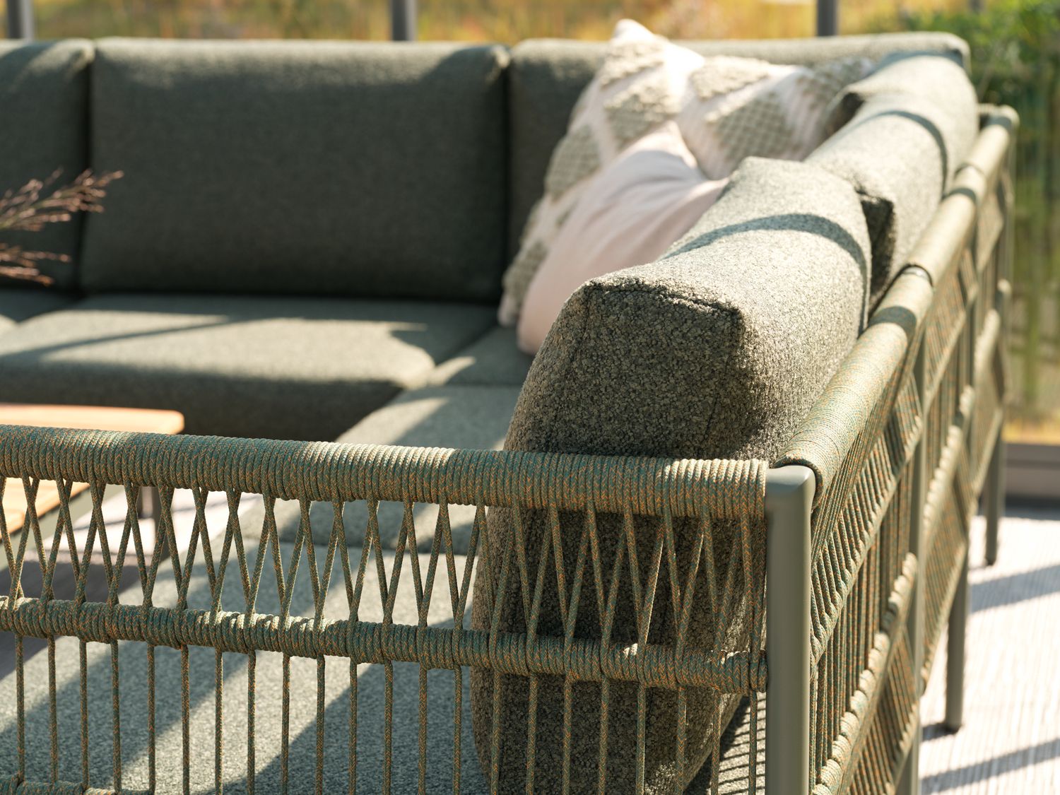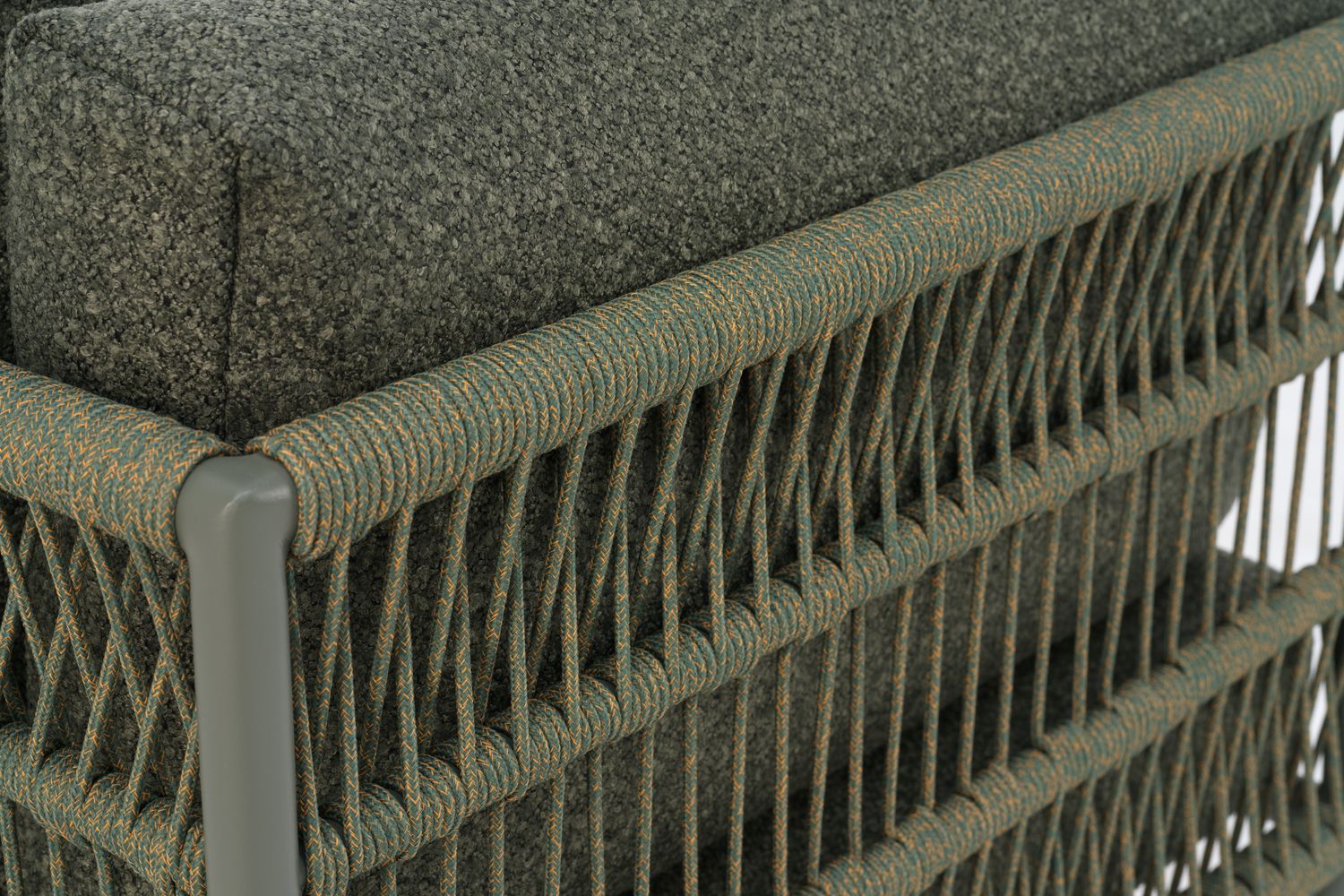 Eine Neuinterpretation der klassischen Lounge. Mit einem abgerundeten Rahmen und Details aus Seil oder Rattan vereint Reno Weichheit und Struktur in einem modernen, reduzierten Look. Großzügige Kissen mit strapazierfähigem Bouclé-Gewebe sorgen für hohen Komfort, während das modulare Design die Serie flexibel und einfach anpassbar macht.