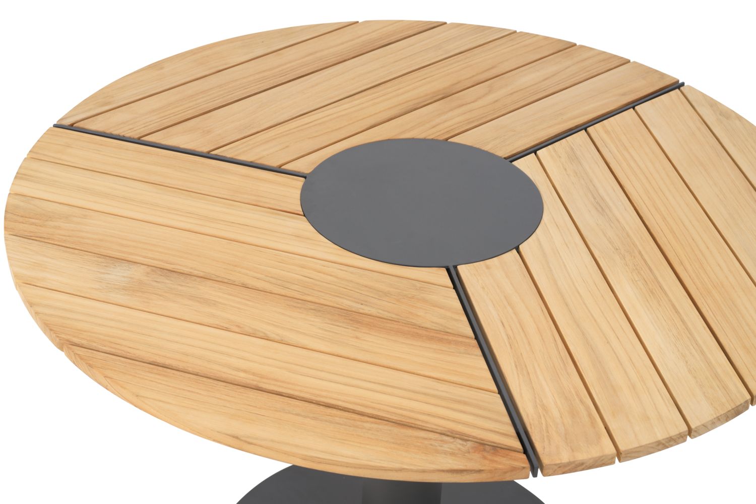 Der Esstisch aus Peace Wood mit Tischplatte aus Teakholz bringt die gleiche Weichheit und Eleganz wie der Rest der Kollektion. Mit einem Aluminiumgestell und einer eleganten Tischplatte aus reinem Teakholz verbindet sich natürliche Wärme mit strengen, modernen Linien. Durchdacht auf Komfort und Stabilität ausgelegt, mit einer praktischen Servierfläche in der Mitte.