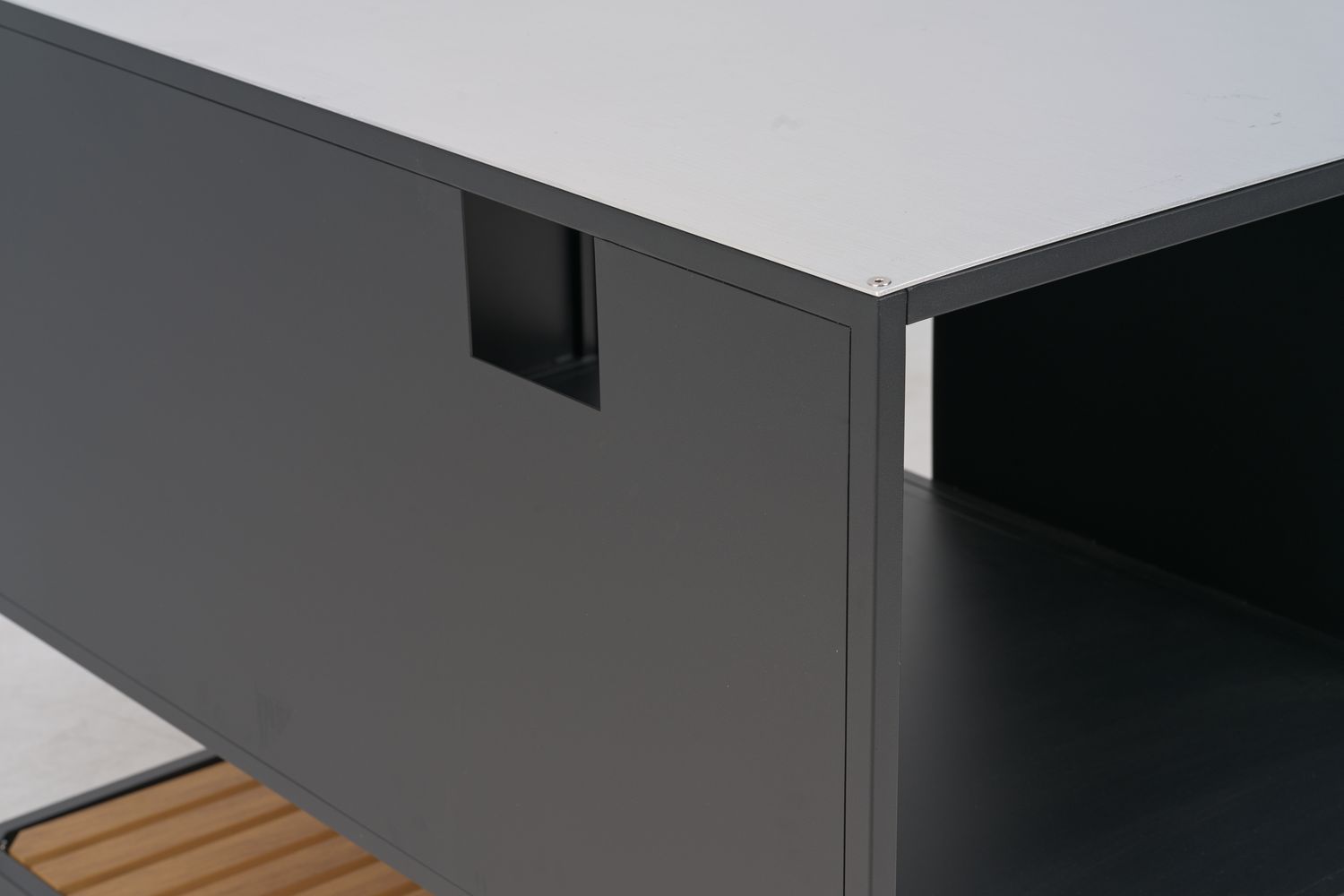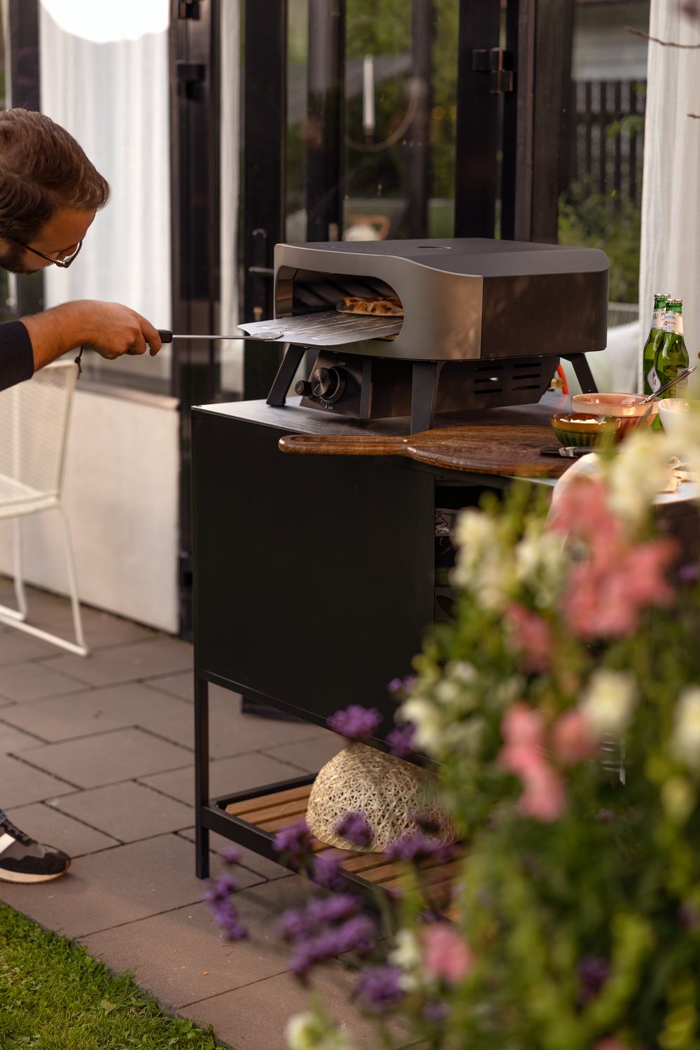 Gemacht für Pizza. Bereit für mehr. Prep ist die perfekte Outdoor-Küche für Pizzaöfen und das Kochen im Freien. Die großzügige Arbeitsfläche besteht aus gebürstetem Aluminium, das kratzfest und leicht zu reinigen ist. Smarte Details wie Platz für eine Gasflasche und eine praktische Ablage darunter machen Prep sowohl funktional als auch stylisch.