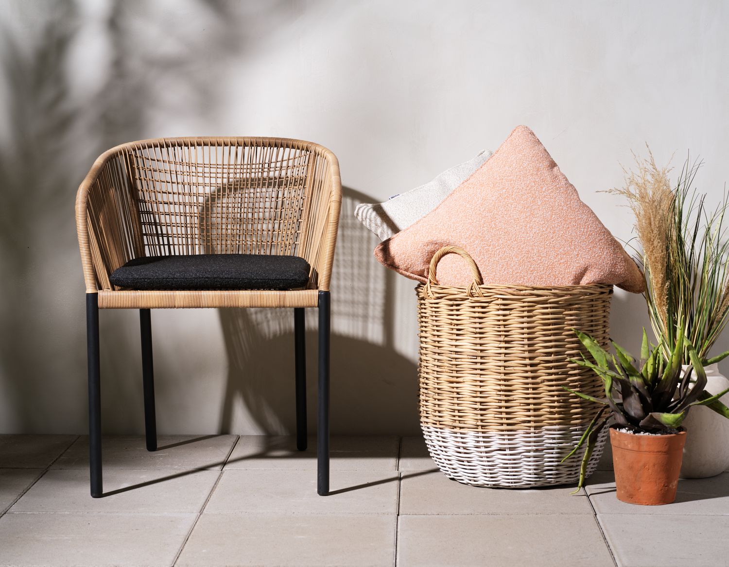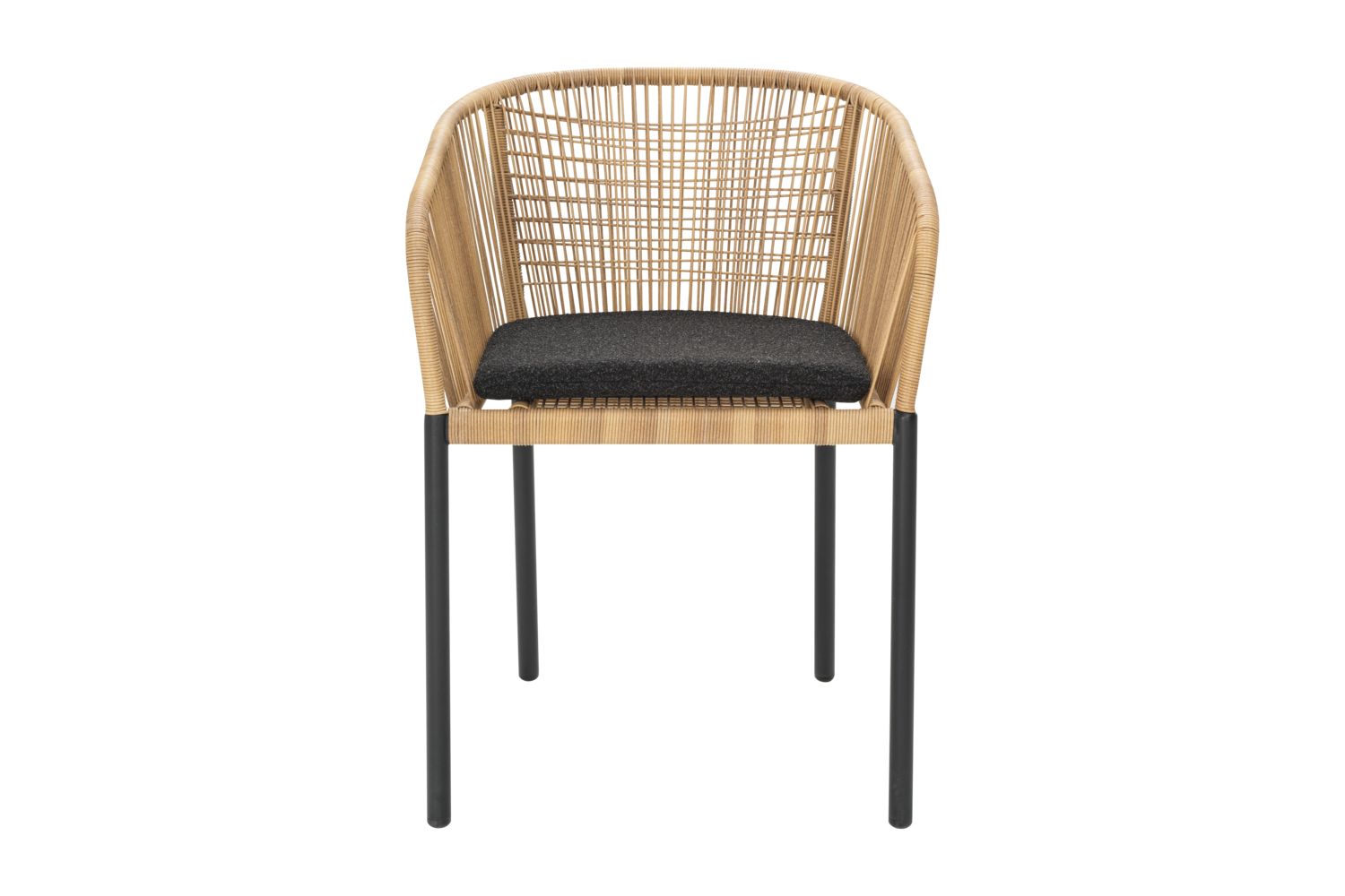 Delta kombiniert Komfort und Langlebigkeit mit elegantem geflochtenem Design. Der pulverbeschichtete Aluminiumrahmen ist rost- und korrosionsbeständig, während das Geflecht in erdigen Tönen einen organischen Ausdruck verleiht. Inklusive weichem Kissen aus Teddy-Stoff. Stapelbar auf bis zu vier Stühle.