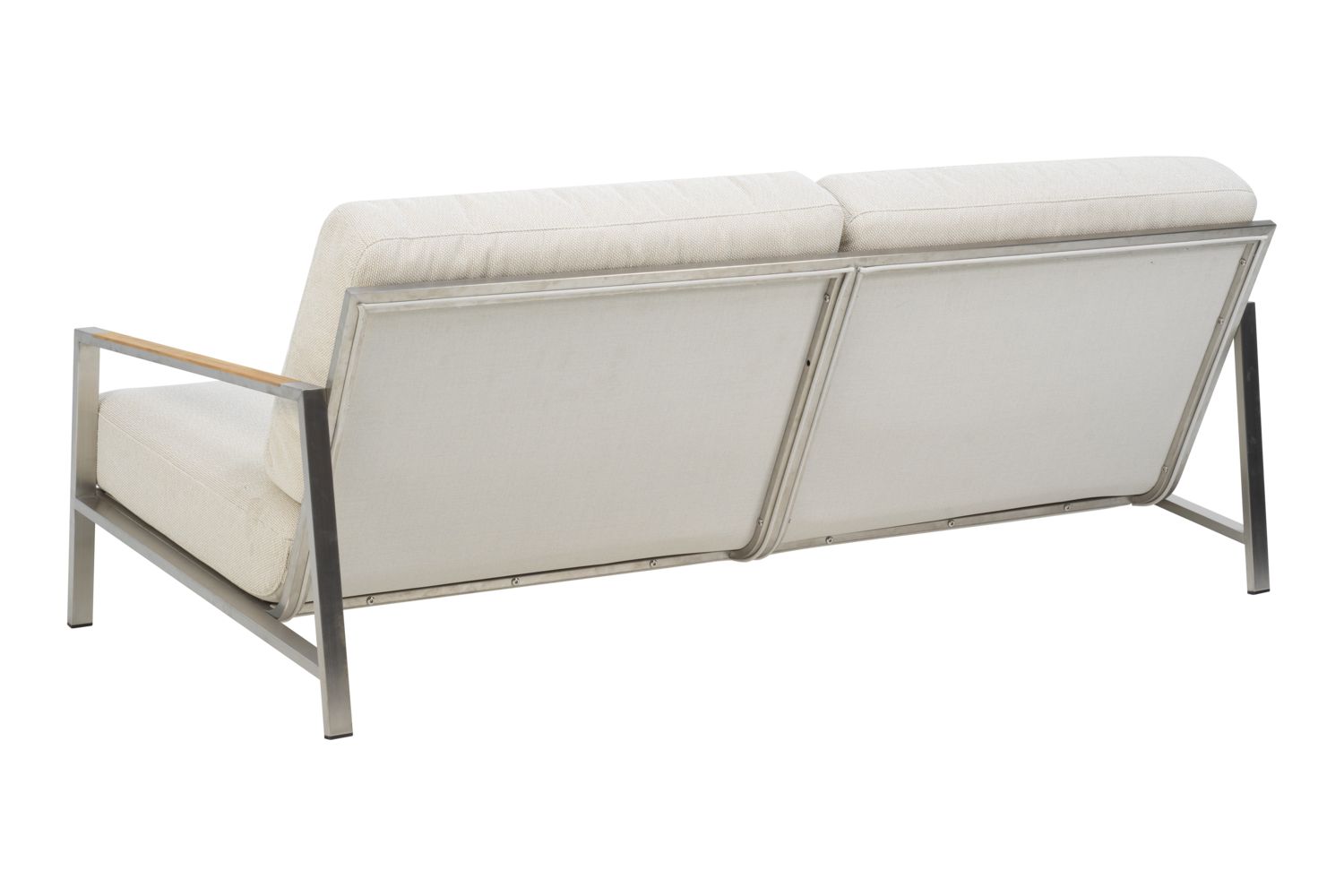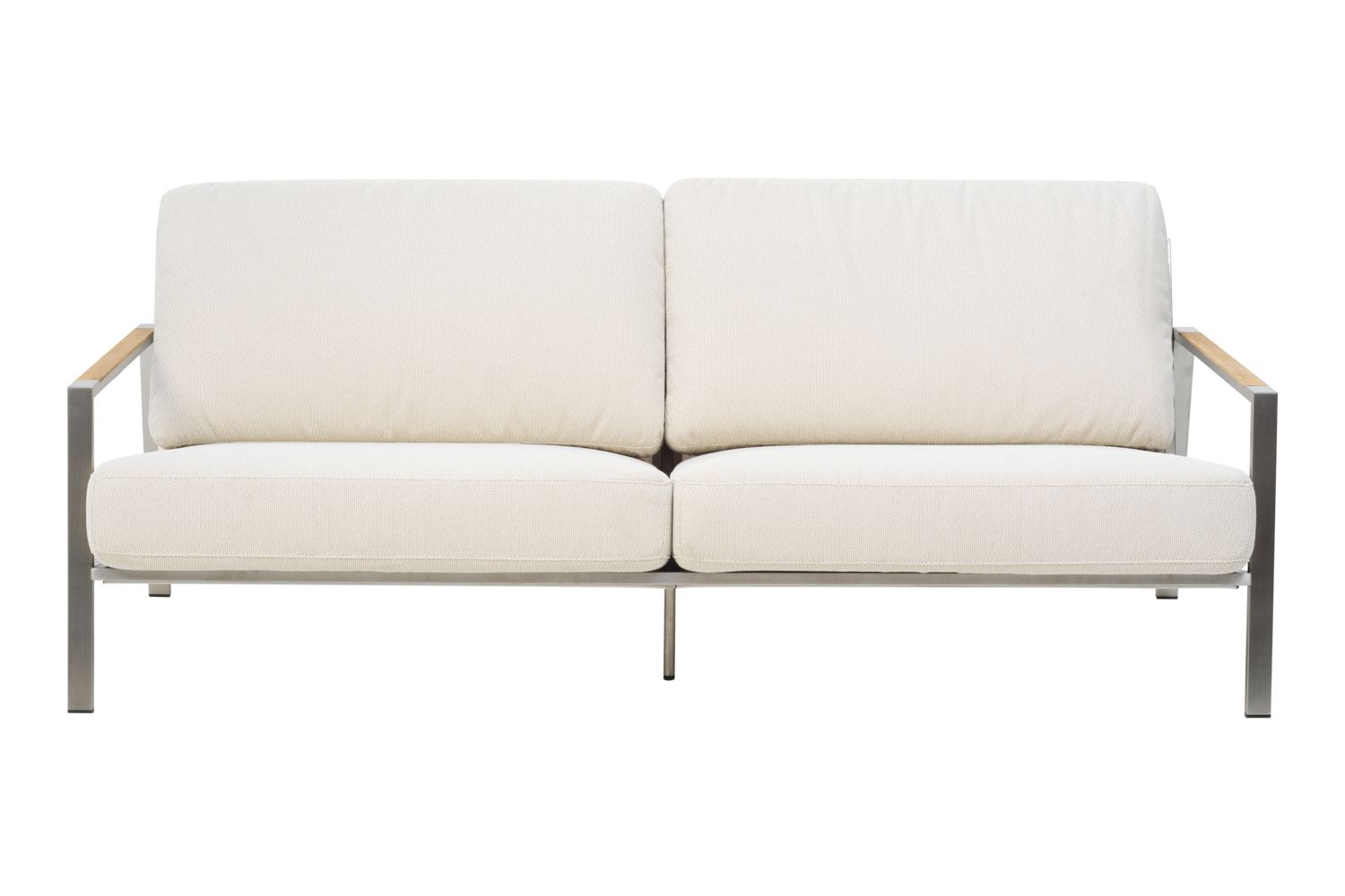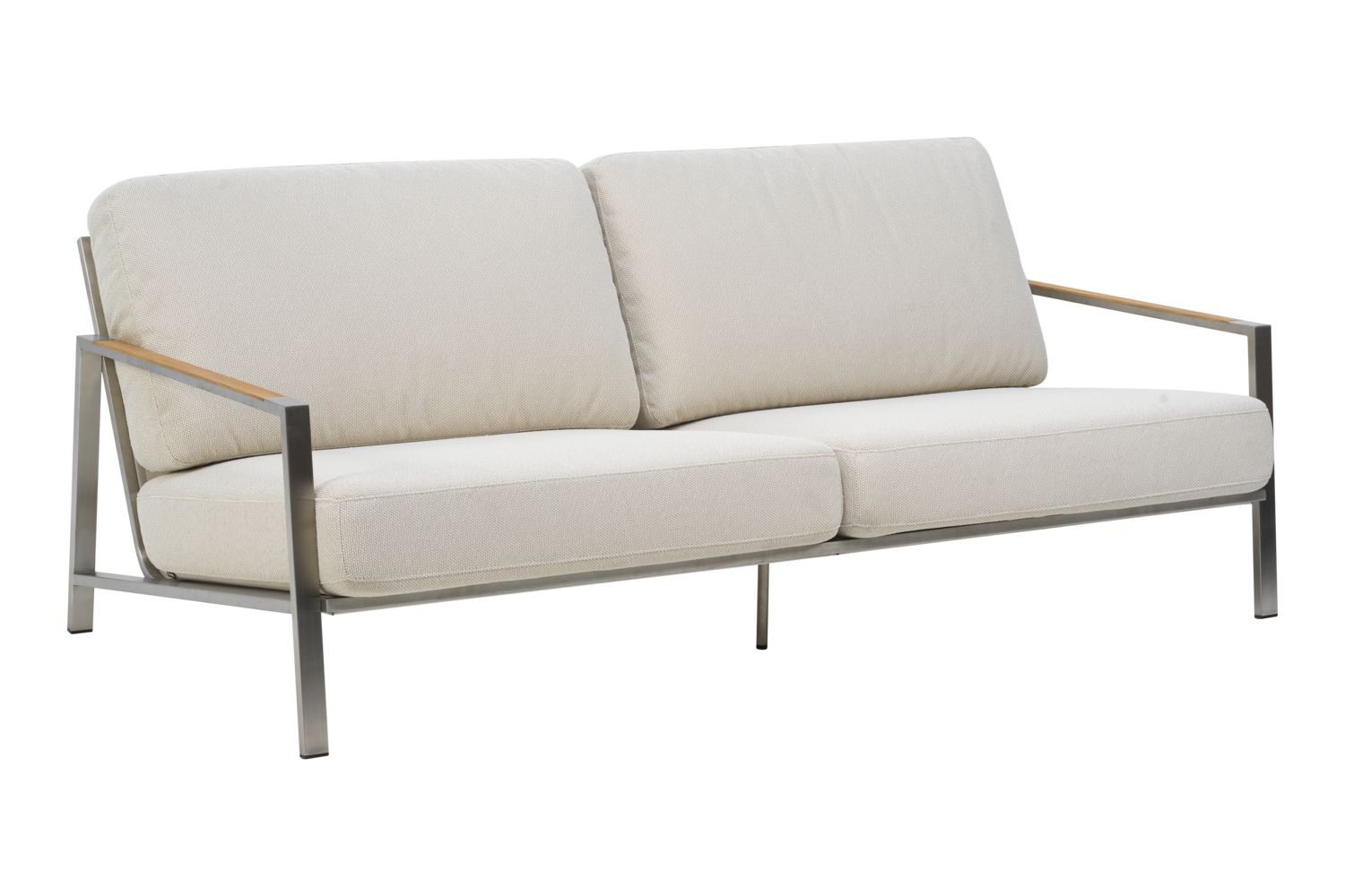Hübsches Sofa, das sich mit seinem Edelstahlrahmen wirklich modern anfühlt. Echte Sitztiefe mit angenehmer Neigung – hier lässt es sich stilvoll entspannen. Das Ganze wird durch die Details geprägt – und die Teak-Elemente an den Armlehnen verstärken das durchdachte Gefühl. Die niedrige Sitzhöhe verstärkt das Gefühl eines modernen Lounge-Stils und bequeme Kissen aus hochdichtem Schaumstoff mit einer Polsterung aus gefüttertem Olefinstoff, der sie wasserabweisend macht. Dies ist eine Sitzecke mit schönen Details und Winkeln. Klare Linien und zeitloses Design in moderner Vintage-Optik. Naos ist eine Serie, bei der die Materialmischung mit höchster Finesse hergestellt wird; Details aus Edelstahl (316) und Teakholz.