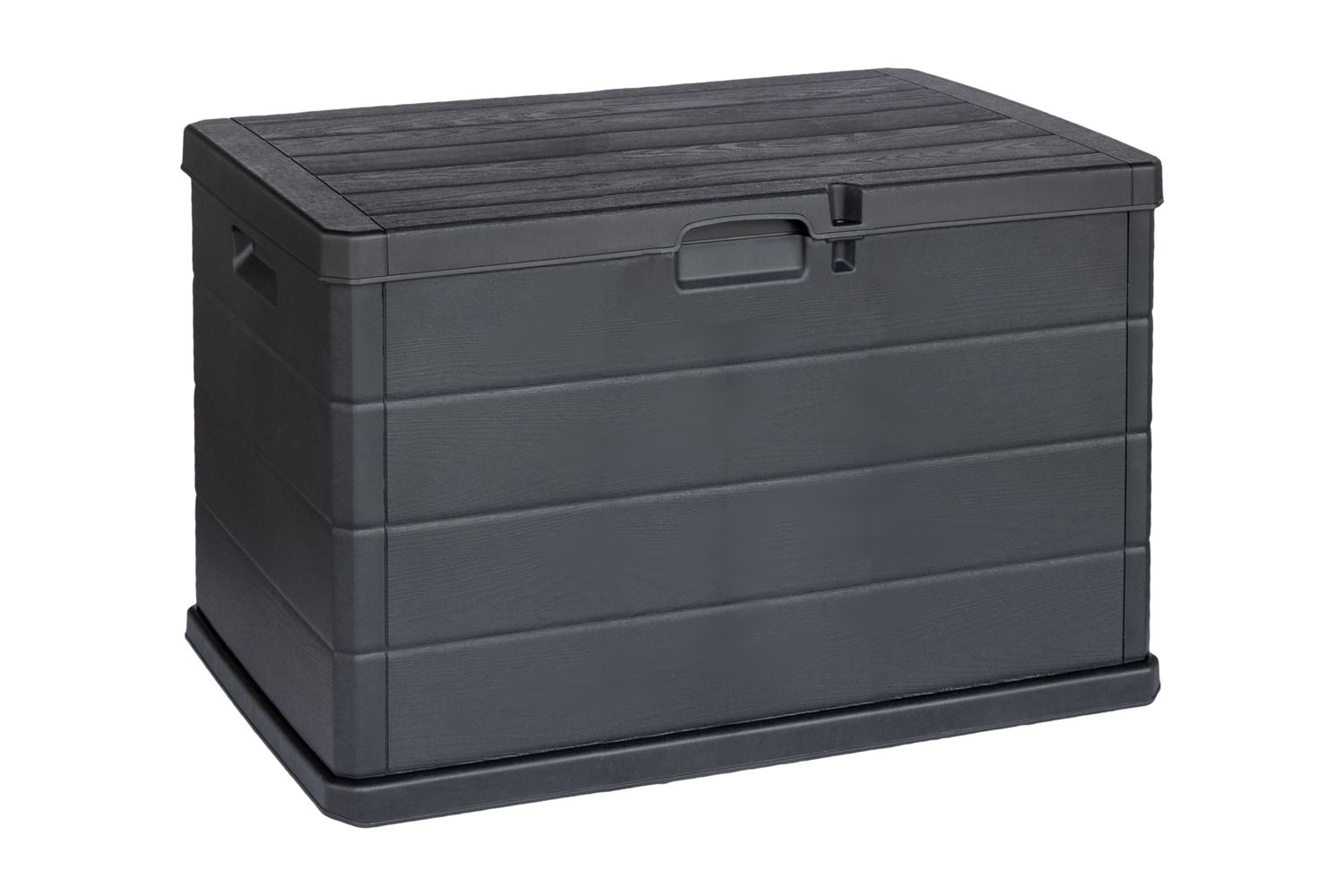 Praktische Kissenbox aus schwarzem Kunststoff mit dezent gemusterter Oberfläche. Erhältlich in zwei Größen und bietet Platz für alles, von Kissen über Spielzeug bis hin zu anderen Outdoor-Gegenständen. Ausgestattet mit Griffen an den Seiten und Löchern für Vorhängeschlösser – leicht zu bewegen und zu sichern.